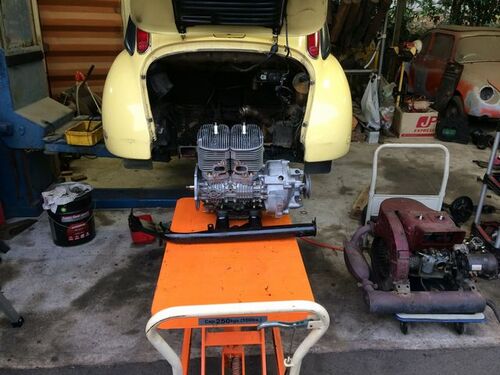 今まで載っていた3速エンジンを降ろして、いよいよ完成したSSのエンジンを搭載します! あ‥、あか~ん! エンジンルーム掃除するの忘れてた‥